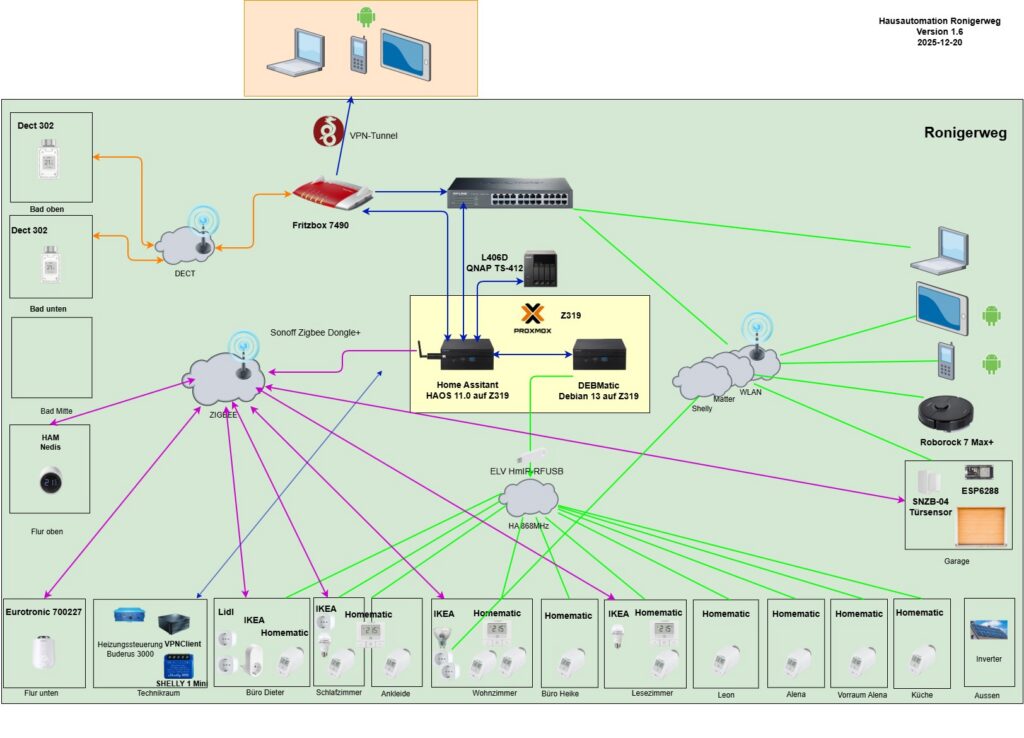 Nach Auswertung aller Test ist nun die Heizung komplett über Home Assistent steuerbar und weitgehend automatisiert, viele Lampen sind umgebaut oder über intelligente Steckdosen steuerbar, die IT-Infrastruktur in die Überwachung eingebunden und weitere Projekte in der Planung. Neben Homematic ünterstützt die Lösung auch Zigbee, Homematic und Shelly. Aktuell teste ich verschiedene Shelly-Module.
